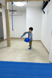午前の子どもたちと一緒に、ペットボトルや卵パック、牛乳パック、段ボールなどいろいろな感触、いろいろな固さ、いろいろな音を感じて遊びました。